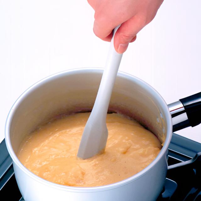 混ぜる、移す、均す、裏ごしに使えるゴムヘラです。特殊金属が中に入っていて、丈夫な一体成型なので衛生的で、耐久性に優れています。