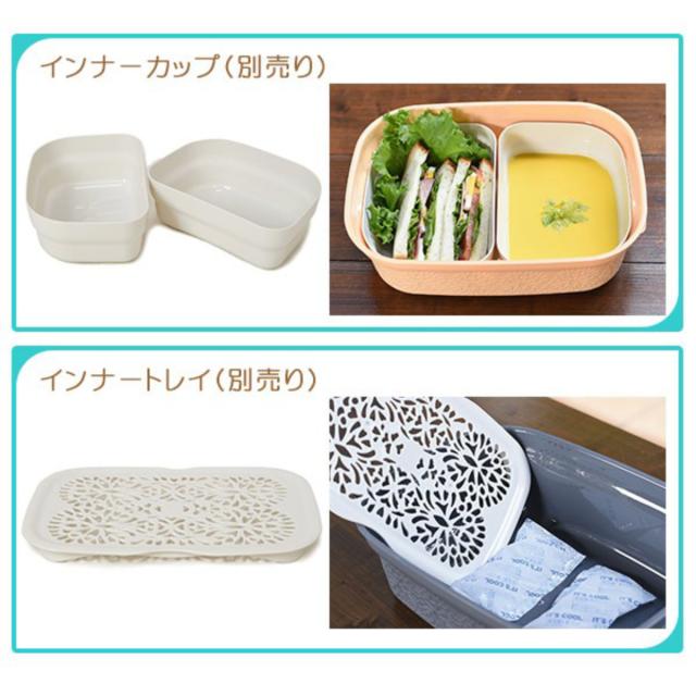 インナーカップ(別売り)は2種類の料理の仕切りに使えて汁や味移りを防いで保存できます。インナートレイ(別売り)は野菜や魚介類の水切り、蒸し料理に際に便利にお使いいただけます。インナートレイの下に保冷剤を置くと持ち運びにも安心です。