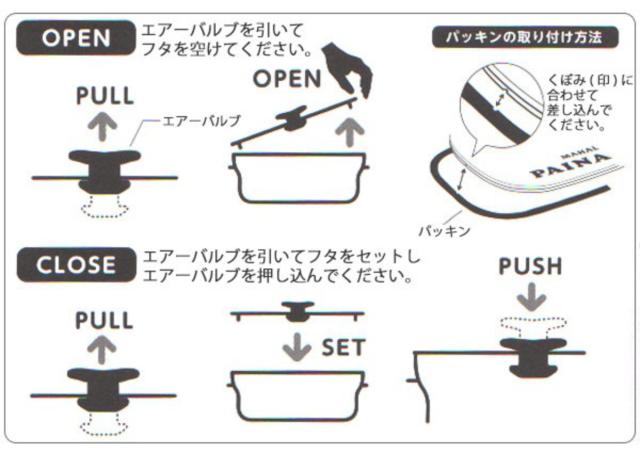 フタの中央にあるエアーバルブを押し込むだけで簡単に密閉できます。フタの内側には密閉性を高め、取り外しも出来るパッキン付きです。