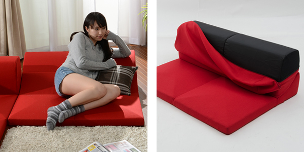 3つのパーツに分かれているので、思い通りのレイアウトを楽しむことができます。1人掛け、2人掛けは背もたれを倒すことができ、まるでベッドのように横になれるリラックス機能付きです。オールウレタンでとても軽量です。女性1人でもレイアウト変更が簡単にできます。