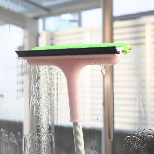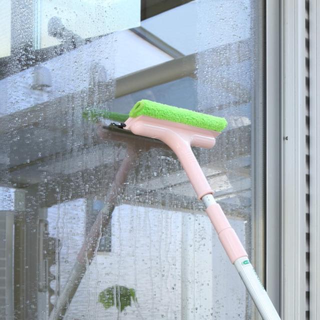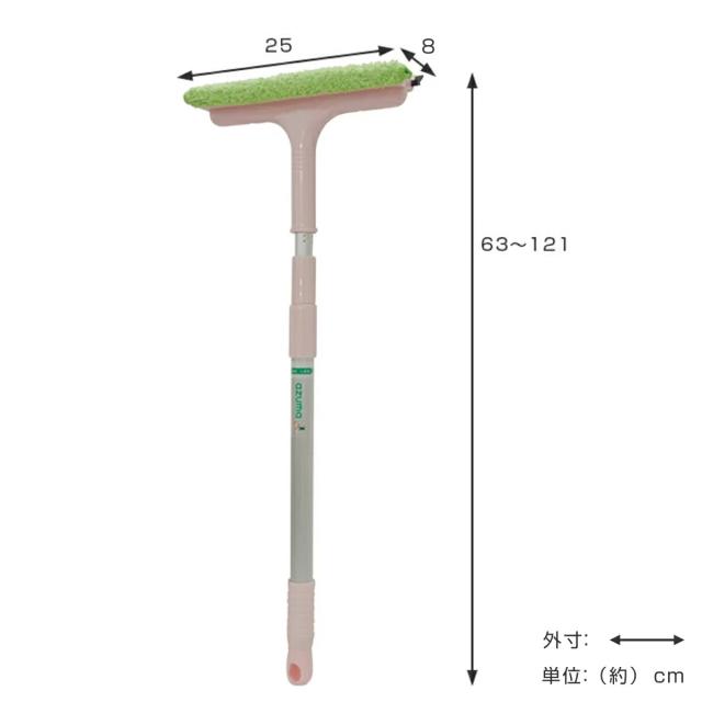 柄は伸縮可能なので、伸ばせば高いところも楽にお掃除できます。外側も室内からお掃除する事ができおすすめです。縮めれば省スペースで収納できます。先端には吊るし穴があるので吊るして収納する事もできます。