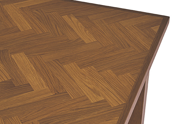 フローリングなどにも用いられるヘリンボーン模様の天板がお洒落です。シンプルな形状ながらも適度なスパイスが加わっており飽きさせません。天板の表面は本物のオーク材を使用しているので木材家具特有の自然な風合いがあります。