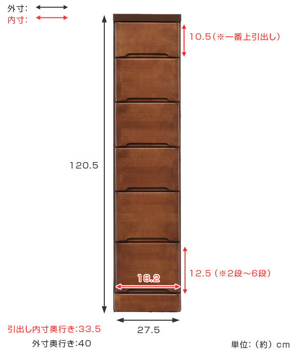| サイズ | 約 幅27.5×奥行40×高さ120.5(cm) 【引出内寸】約 幅18.2×奥行33.5×高さ(一番上引出し)10.5、(その他引出し)12.5(cm) |