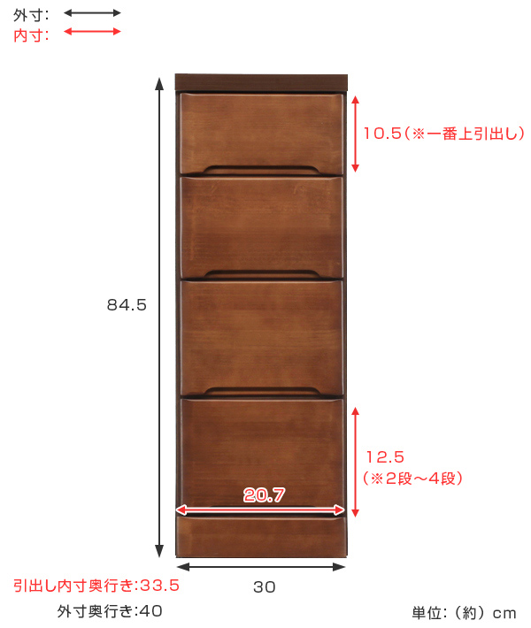 | サイズ | 約 幅30×奥行40×高さ84.5(cm) 【引出内寸】約 幅20.7×奥行33.5×高さ(一番上引出し)10.5、(その他引出し)12.5(cm) |