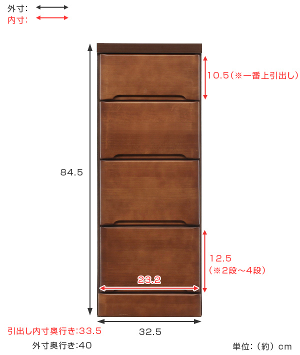 | サイズ | 約 幅32.5×奥行40×高さ84.5(cm) 【引出内寸】約 幅23.2×奥行33.5×高さ(一番上引出し)10.5、(その他引出し)12.5(cm) |