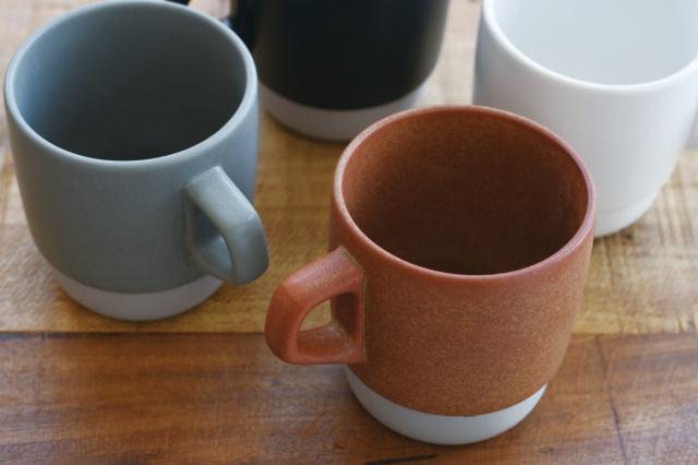 手触りのよい土肌と、マットな釉薬を組み合わせたマグカップです。グレイッシュな色土と、ダークトーンの色釉薬が織りなす掠れた風合い、ホワイトの釉薬にはあえて白磁を組み合わせ、白の清さを表現しています。