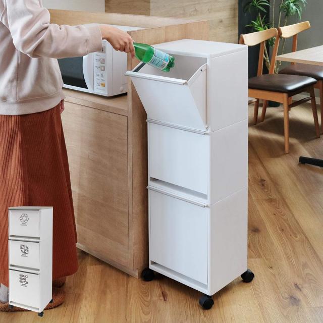 ゴミ箱 43L 3段 資源ゴミ 分別ワゴン ワイド ( ごみ箱 43リットル 3分別 フラップ ふた付き 縦型 キッチン 幅33.5cm 隙間 収納棚 ストッカー ダストボックス 引き出し フラップ棚 分別ゴミ箱 キャスター付 シンプル おしゃれ 収納 )