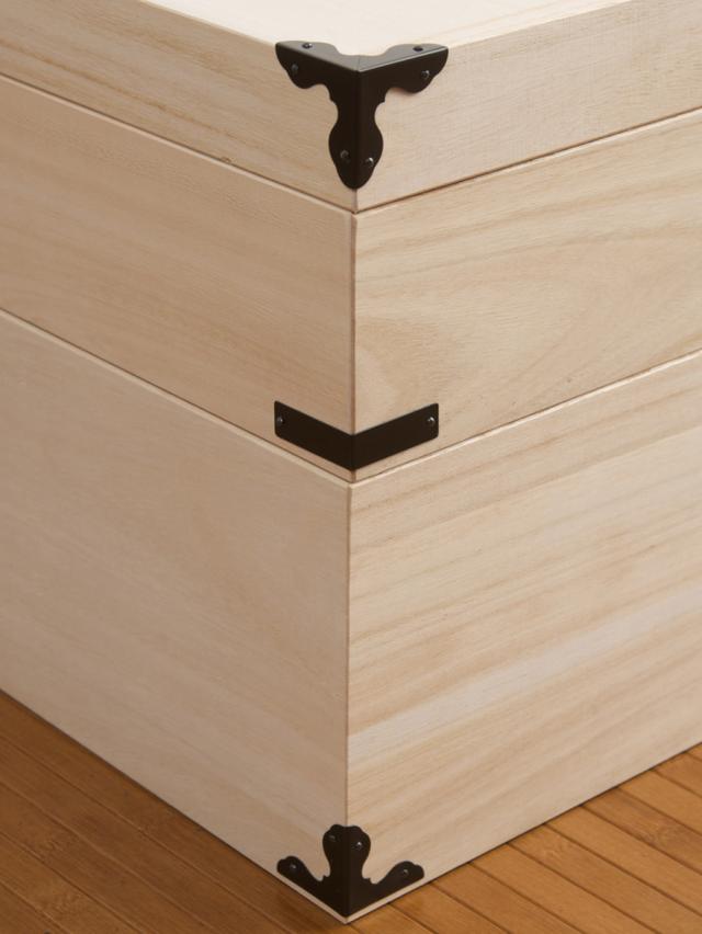 隅には、補強の役割も担っている金属製の飾り金具が付いています。細部に至るまで丁寧に仕上げた逸品を長くお楽しみください。