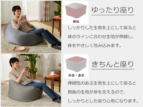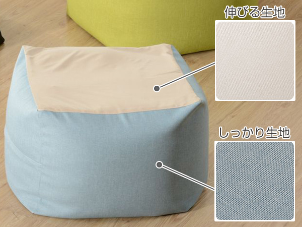 伸縮性の違う2種類の生地を使うことで、自由自在に形が変わります。伸びる生地だけで作ったクッションでは、中のビーズが流れすぎてお尻が床についてしまうことも。しっかりした生地と組み合わせることで、程よい位置でビーズがとまり、より身体にフィットします。気分によって座り方を変えてみてはいかがでしょうか♪