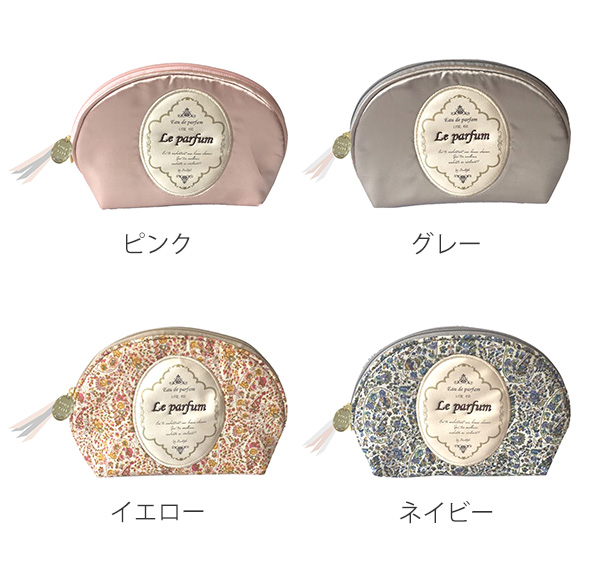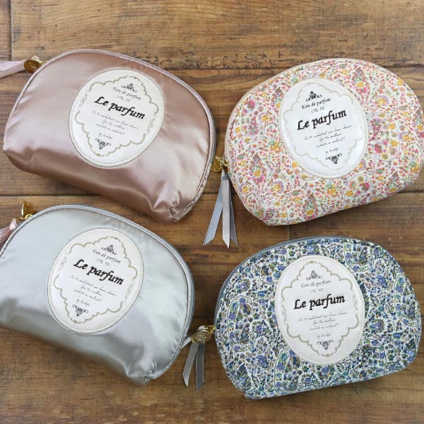 外側がグレーのサテン地のポーチは内側が花柄のネイビー、反対に外側が花柄のネイビーのポーチは内側がグレーのサテン地となっています。