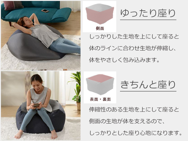 伸縮性の違う2種類の生地を使うことで、自由自在に形が変わります。伸びる生地だけで作ったクッションでは、中のビーズが流れすぎてお尻が床についてしまうことも。しっかりした生地と組み合わせることで、程よい位置でビーズがとまり、より身体にフィットします。気分によって座り方を変えてみてはいかがでしょうか。