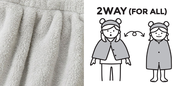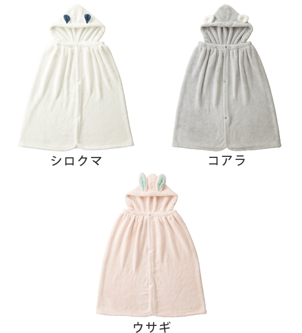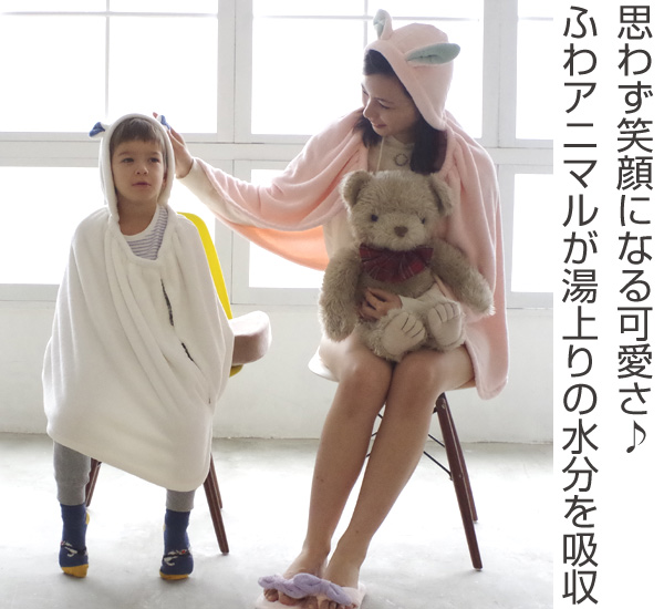 | ふわふわの肌ざわり♪ 吸水力抜群のマイクロファイバーを使用しています。髪の水分をしっかり吸水してくれるので、湯冷めも防ぎます。お風呂上りだけじゃなく、プールの後などにも最適です。 | 家族みんなで使える 子どもはラップタオルとして、大人はポンチョとしてお使いいただけます。 |