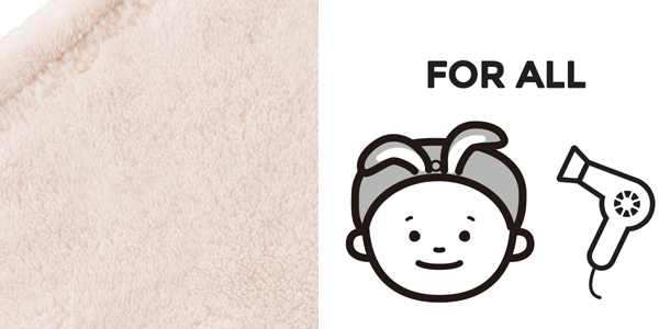 | ふわふわの肌ざわり 吸水力抜群のマイクロファイバーを使用しています。髪の水分をしっかり吸水してくれるので、湯冷めも防ぎます。お風呂上りだけじゃなく、プールの後などにも最適です。 | もちろん、お子様も使えます 伸縮性があるので、大人だけじゃなくお子様もお使いいただけます。髪の毛を守りながら、タオルドライができます。 |