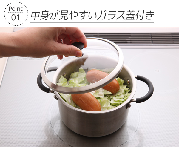 鍋には、煮物などに便利なガラス蓋が付いています。ガラスなので調理中も中身を確認でき安心です。