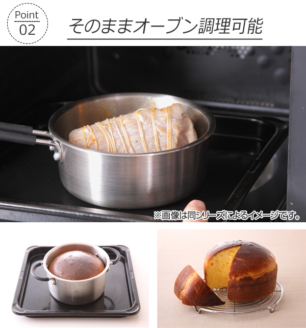 オーブンにも対応した耐熱性ハンドル(耐熱温度230度)なので、鍋をそのままオーブンに入れて加熱できます。パン作りなどにも大活躍します。