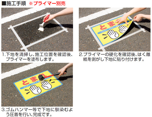 ●屋内外を問わず、路面に直接貼れる路面標識です。あらかじめ路面のゴミ・ホコリ・水分・油分・塗装等をよく落としてください。