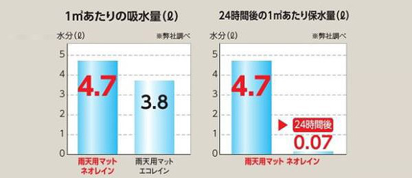 極細繊維による毛細管現象により、速やかに水分を吸い取り、1平方メートルあたり約4.7リットルの吸水力を発揮します。(上図左参照)また、24時間後の1平方メートルあたりの保水率はわずか約1.4%(約0.07リットル)で水はけが良く、優れた速乾性能と相まって雨天時のエントランスを快適に保ちます。(上図右参照)