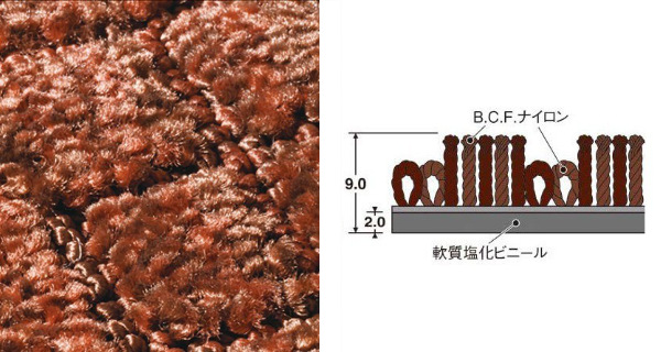 | 材質 | 表面:ナイロン100%(B.C.Fナイロン) 裏面:軟質塩化ビニール |