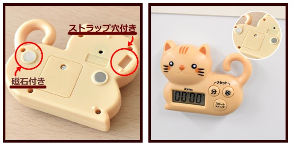 ねこがモチーフのかわいいタイマーです。本体は立てて置いたり、冷蔵庫など磁石がくっつくところにはったり、ストラップを付けて首からさげたりと様々なシーンでご使用いただけます。キッチンや机の上に置けば料理や勉強も楽しくなること間違いなしです。