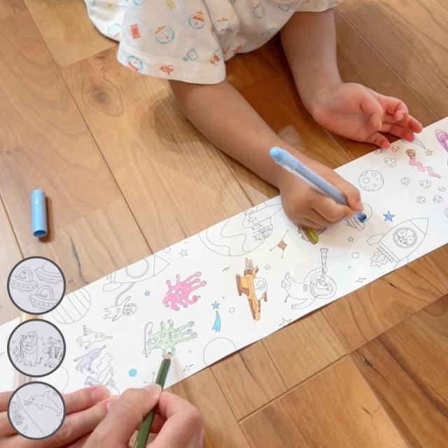 ロール状の塗り絵は広げると長く、子どもたちの好奇心をかき立てます。色を塗るだけではなく、余白にセリフやキャラクターを書き足してオリジナルのストーリーを作り出すことができます。長いのでお友達と一緒に楽しみながら塗り絵ができ、会話も広がります。