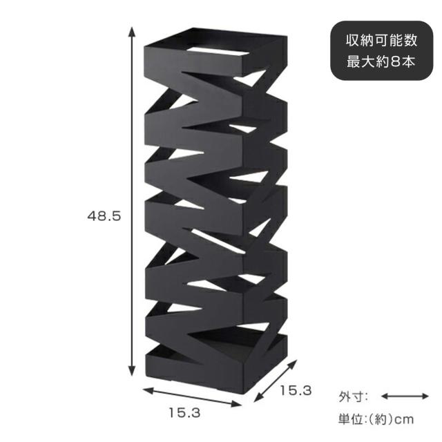 奥行15.3cmのスリムなスクエアタイプです。コーナーに置くと壁にフィットするので、置いても邪魔になりません。最大で約8本の傘を収納できるので、急な来客時も安心です。