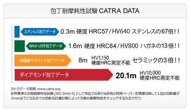 超高硬度ダイアモンド粒子の含有により長期間にわたり最高の切れ味が持続します。他社セラミック比較で約3倍、他社ステンレス比較で約67倍もの超永切性能が、世界標準の刃物耐摩耗性試験データで証明されました。