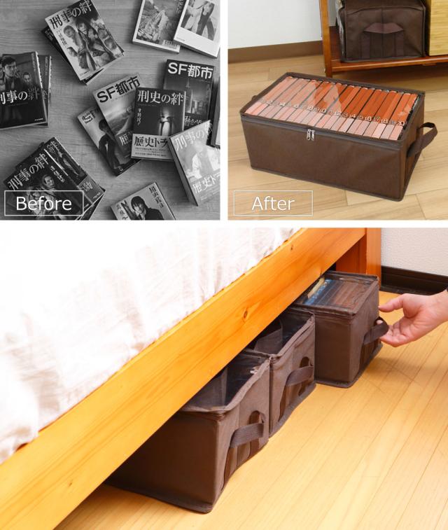 B6サイズの青年コミックをすっきり収納できる、仕切り付きの不織布ボックスです。通気性の良い軽量素材を使用し、扱いやすく普段使いにもぴったり。コンパクトなサイズ感で、ベッド下や棚上などのデッドスペース活用にもおすすめです。