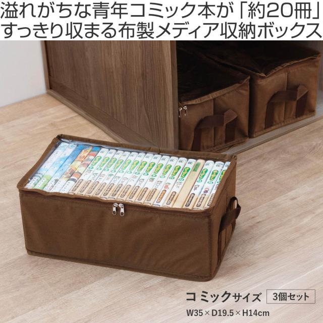 収納ボックス 青年コミックサイズ 幅35×奥行19.5×高さ14cm メディア収納 布製 3個セット ( 収納ケース 収納 コミック収納 漫画 コミック B6 仕切り 底板 透明窓付き 保管 布 不織布 ファブリック 新書 少年コミック ソフト )