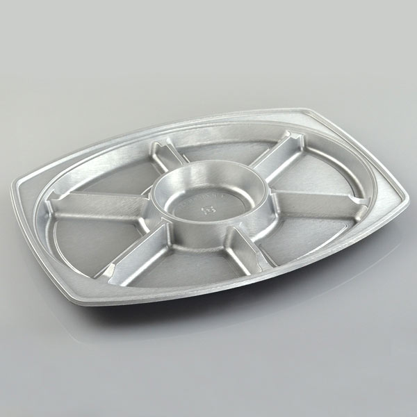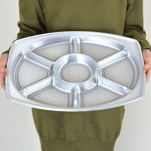 表面のシルバー色が料理を豪華に彩る、仕切りつきのオードブル皿です。