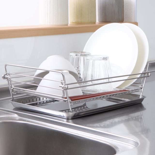 洗練されたデザインで細部まで丁寧に仕上げられた、水切りラックです。余分なものがなく、シンプルなラインが魅力的。キッチンを清潔感ある空間にながら、大きなお皿やグラスなどをまとめてすっきり収納できます。