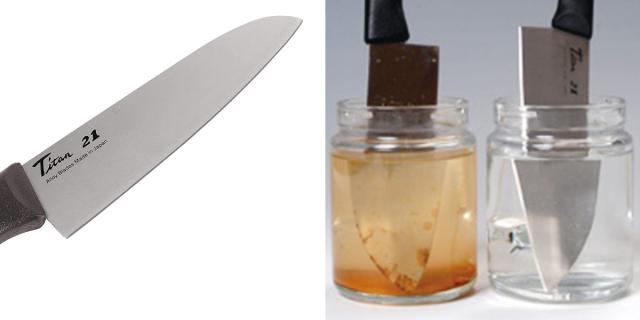 軽量・高剛性の素材としてメガネのフレーム・ゴルフのヘッド・潜水艦などに使用されているチタン。しかし、その加工の難しさや素材の原材料費の高さから、超高額商品にのみ使用されて来ました。 また、チタンはその硬度から、包丁の素材には向いていないとも言われていました。フォーエバー社は世界初の製法により、切れ味が長持ちする包丁の開発に成功しました。