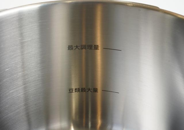 鍋の内面には最大調理量の目盛りが付いています。最大調理量を超えないように材料と水、調理料を入れてください。特に豆類や麺類等のように煮炊きによって分量が増えるものは、豆類最大量目盛りを超えて使用しないでください。