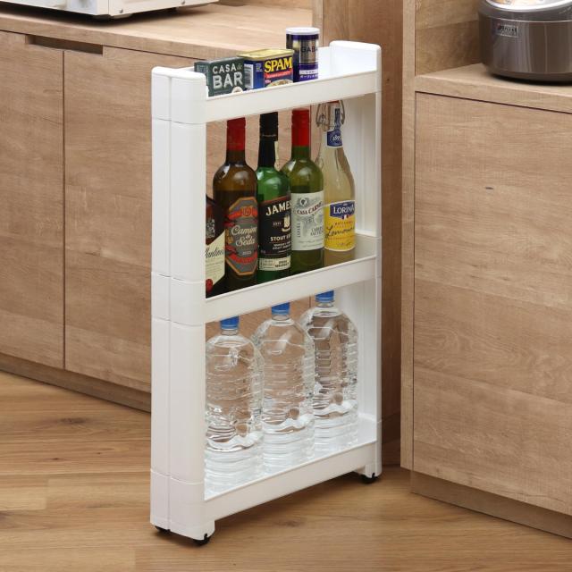 よく使う調味料や食品のストックの収納を3段に分けて整理できます。下段には、2Lのペットボトルが4本も入る大満足の収納力。スリムながらたくさんの物を収納することができます。