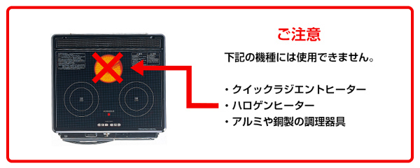 ※クイックラジエントヒーター、ハロゲンヒーター、アルミや銅製の調理器具、磁石のつかない多層鍋には使用できません。