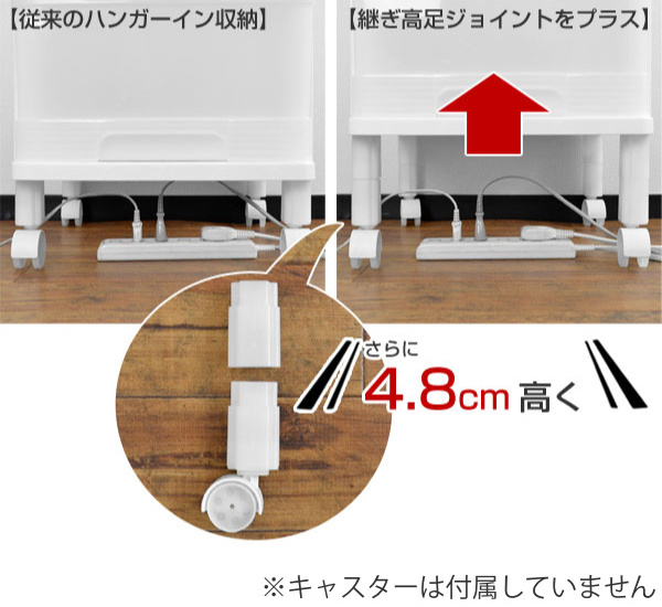 ハンガーイン収納ケースの脚は床から10cmですが、継ぎ高足ジョイントパーツを使うことで、さらに4.8cm上がります。床から高さが欲しいときや、紛失や破損の際の交換部品としてもご利用いただけます。