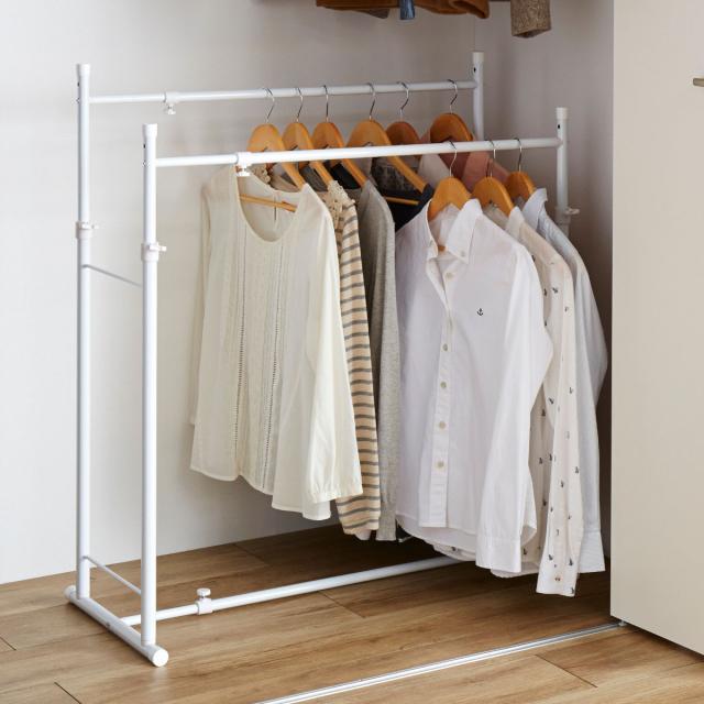 スペースや衣服の量に合わせて幅と高さを調節できる、空間を有効活用しやすい2連ハンガーラックです。押入れでもクローゼットでも使用可能。クローゼットバーにかかった服に手が届かないお子様も、こちらを使えばひとりで服を掛けられます。かさばる衣服をキレイに収納することが出来、乱雑になりがちな収納スペースがスッキリ整理できます。