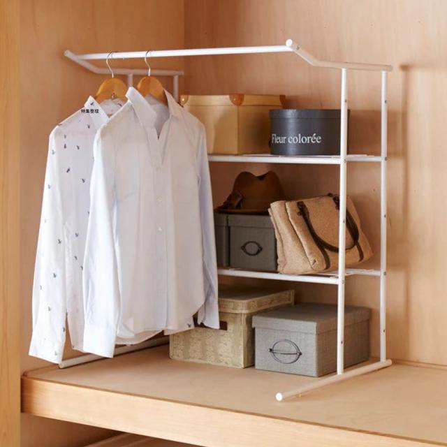 手前は洋服がけに使えるハンガーパイプで、奥は小物の収納に使える2段の収納棚になっている、1つで2役の便利なハンガーシェルフです。かさばる衣服や小物をキレイに収納することが出来、乱雑になりがちな収納スペースがスッキリ整理できます。クローゼットバーにかかった服に手が届かないお子様も、こちらを使えばひとりで服を掛けられます。