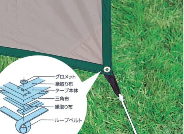 ループベルトと三角巾(補強布)をヘキサタープの各コーナーにつけることで補強しています。