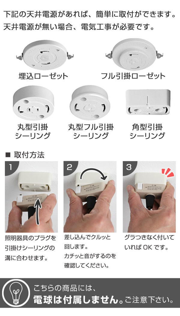| 備考 | 対応電球:E26/100Wまで(3個)、ナツメ球:E12-5Wまで(1個) スイッチ:引き紐式 コード長:約50cm 目安畳数:約8畳まで |