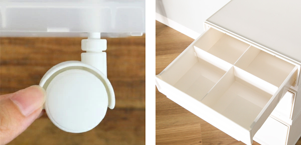 | キャスターで移動も楽々 別売りのキャスターをつければお掃除や衣替え時の移動も楽々です。キャスター使用時は、高さが約4cmアップとなります。取り付けも差し込むだけの簡単取り付けです。 | 小物の整理に便利な仕切り付き 仕切りは着脱可能なので十字で使用したり縦・横1枚でもお使い頂け、中に入れるものに合わせて仕切ることができるので便利です。 |