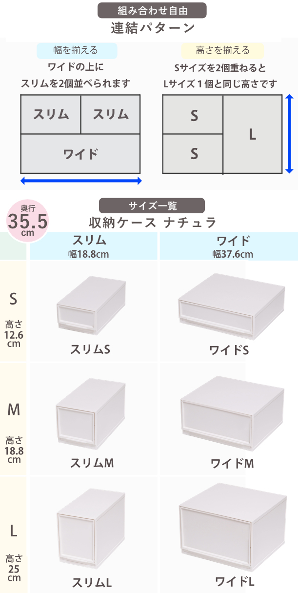 ![]() スリムS 幅18.8×奥行35.8×高さ12.6cm | ![]() スリムM 幅18.8×奥行35.8×高さ18.8cm | ![]() スリムL 幅18.8×奥行35.8×高さ25cm |