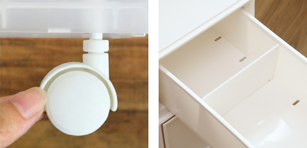 | キャスターで移動も楽々 別売りのキャスターをつければお掃除や衣替え時の移動も楽々です。キャスター使用時は、高さが約4cmアップとなります。取り付けも差し込むだけの簡単取り付けです。 | 小物の整理に便利な仕切り付き 小物の整理に役立つ着脱可能な仕切りが付いています。中に入れるものに合わせて仕切りの位置を変えられるので便利です。 |