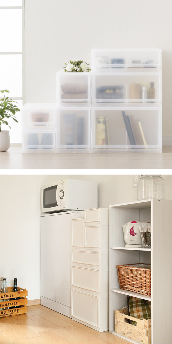 並べて重ねて自分好みにアレンジできる引き出しタイプの収納ケースです。リビングはもちろん、子ども部屋でお子さまの洋服やおもちゃを入れたり、洗面所でタオルや洗剤・シャンプーなどのストック入れにも最適です。3種類の高さ(S・M・Lサイズ)と2種類の幅(スリムタイプ・ワイドタイプ)から選んで組み合わせてお部屋にあった自分スタイルの収納にカスタマイズできます。