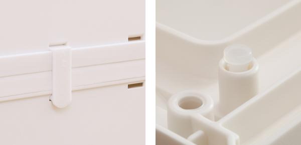 | 前倒れ防止の連結部品付き 前倒れ防止の連結部品が付いているので、積み重ねたケースの引き出しを使用する時も安心してご使用いただけます。 | 底面滑り止め付き 本体底に付属の滑り止めを装着することで、本体が安定します。 |