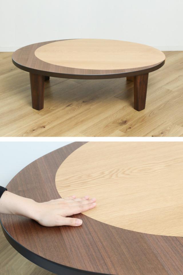 楕円形の天板に浮かぶ三日月模様が印象的な座卓です。明るいナラ材をベースに、深みのあるウォールナットを組み合わせることで、木目のコントラストと立体感が際立ちます。置くだけで空間を引き締める、上質なモダンデザインです。