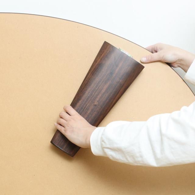 脚部は無垢材を使用しますが天板(テーブル面)には軽量化を図りつつ木質板に突板(天然木を薄く剥いだもの)や木目シートを貼り、重厚感と高級感を感じられる作りとなっています。