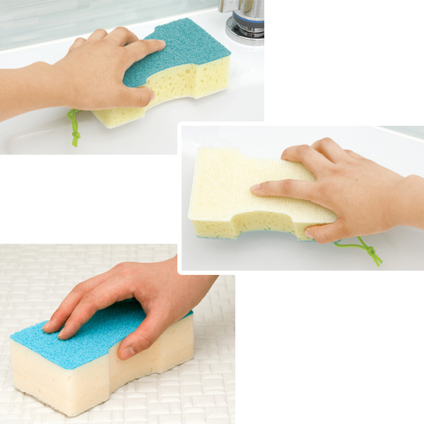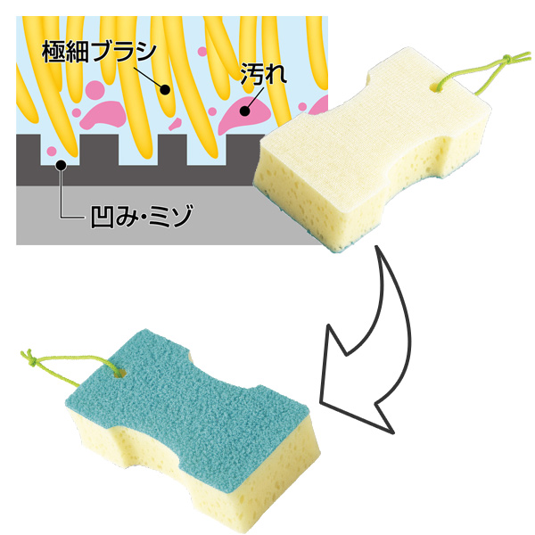 槽洗いに適したアクリル繊維の細かい溝がバスタブ等に付着した油分の多い湯アカを吸着し、キズをつけずに水だけでも汚れを落とします。凹凸面洗いに適した極細ブラシ面がスポンジでは届かない凹凸床や凹凸ガラスの細かな凹みやミゾに入りこんだ汚れをすっきりかき落とします。