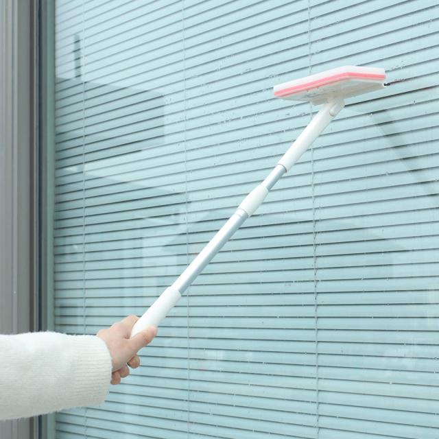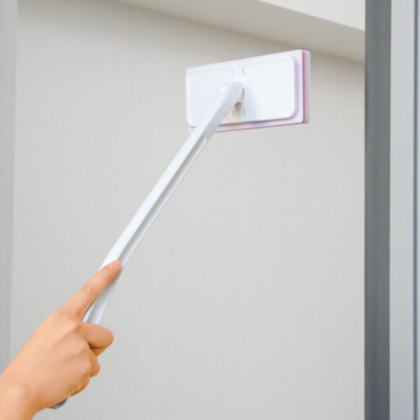 ヘッド部は斜めに角度を変えて固定できるので、窓の隅や高い場所もお掃除しやすいです。使用しないときは垂直に戻せるため、場所を取らずに収納できます。