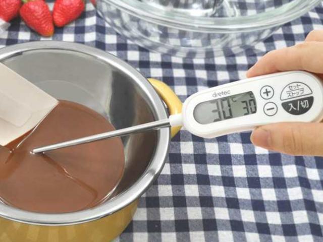 温度上昇、下降時にもアラーム設定することが可能なので、温度管理が繊細なお菓子作りにも最適です。濡れた手でも使用できる防滴タイプで、ボタンや画面から水が入らないようになっています。