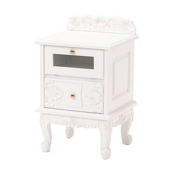 | エレガントな装飾と猫脚 細部まで惜しみなく施された浮彫りのデザインは、職人が一つ一つ丁寧に仕上げています。猫脚は先がコロンと丸く愛着のある形です。 | 気品漂う引出し 引出しが3杯付いているのでアクセサリーや筆記用具類など種類別に分けてきれいに片付けられます。 |